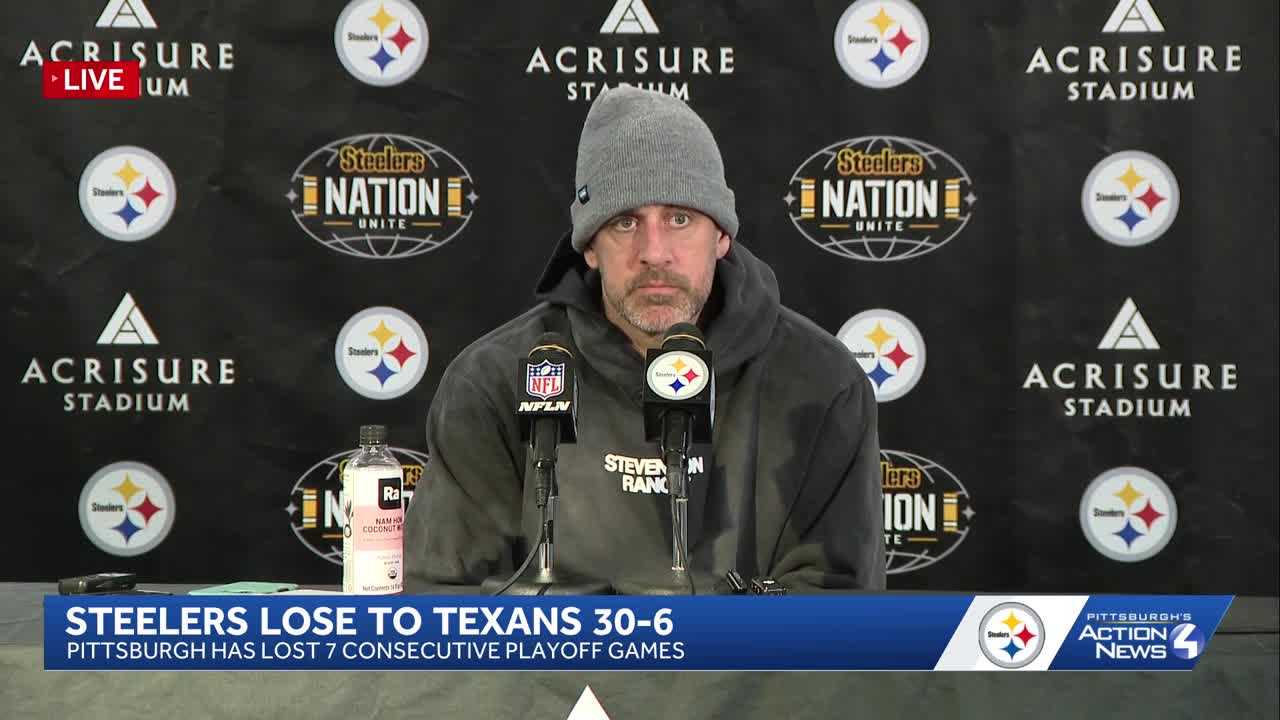 Was Monday’s loss against the Houston Texans the last time you’ll see Aaron Rodgers as a quarterback? That is one question that still remains up in the air after the Pittsburgh Steelers fell 30-6, landing the team their seventh straight playoff game loss. When asked about his future in the NFL, Rodgers said he’s not going to make any emotional decisions. “This was such a fun year. A lot of adversity, but a lot of fun,” Rodgers said. “You know, my life in the last year – this is a really good part of that. Coming here and being a part of this team. So it’s disappointing to be sitting here.”From the Beginning The four-time MVP and a Super Bowl winner signed a one-year deal with Pittsburgh in June of last year. That deal: A $13.65 million contract with a reported $10 million guaranteed and a maximum value of $19.5 million. In addition, it was reported to include $5.85 million worth of playtime and team performance incentives.That one-year contract means Rodgers will be a free agent following the end of the season. “So that’ll give me a lot of options if I still want to play. (Maybe) not a lot of options, but there’ll be options, I would think. Maybe one or two,” Rodgers said prior to the Steelers’ loss on Monday.