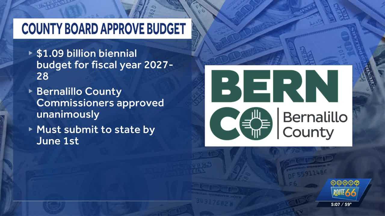 Bernalillo County’s Board of County Commissioners unanimously approved $1.09 billion for the Fiscal Year 2027 spending plan on Tuesday.The budget outlines $478.7 million for the General Fund and $361.9 million in other funds, while setting aside reserves for state and local requirements.Funding includes investments in public safety, along with expanded support for libraries and park maintenance.County employees will see a 1% pay increase. The plan adds 17 new full-time positions and carries over more than $228 million for ongoing projects. Revenue is expected to grow slightly through taxes, though leaders say they will monitor economic conditions closely.County officials must submit the approved budget to the state by June 1.