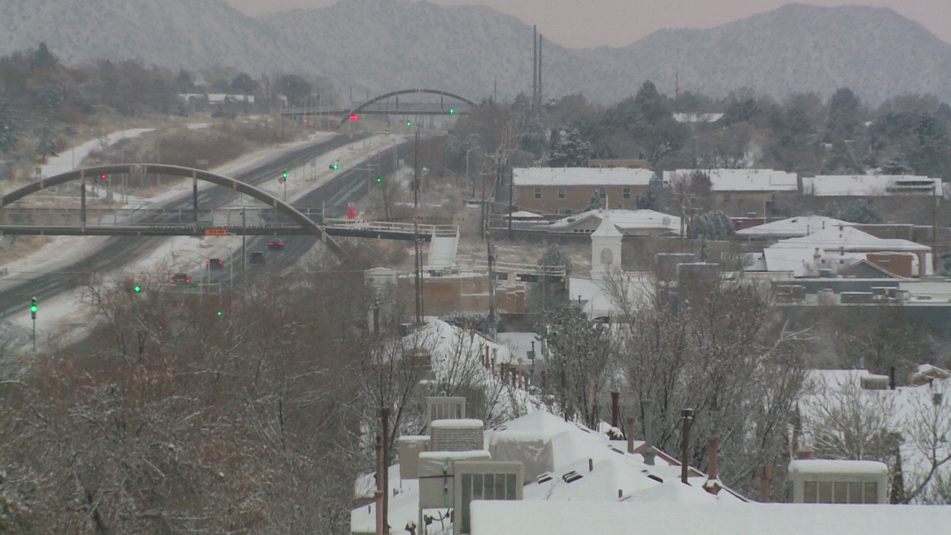 THE SCENE. YOU GOT TO GO ON BOTH SIDES OF THE BIG SNOW BRIM THERE IN THE MIDDLE OF THE ROAD. THESE ARE WEEKEND TOTALS. SO STARTING FRIDAY, WRAPPING UP SUNDAY MORNING, HOW MUCH SNOW DO WE PICK UP AT OUR SKI AREAS? SEVEN INCHES AT EIGHT INCH FIRE, EIGHT INCHES AT SKI SANTA FE. AND FOR SANDIA PEAK IT WAS 11IN. SIPAPU JUST OVER A FOOT FOR TAOS SKI APACHE, THE BIG WINNER. THERE’S ALMOST THREE FEET OF SNOW. THAT’S WHY WE’VE GOT THOSE POWER OUTAGE PROBLEMS THERE IN AND AROUND THE RUIDOSO AREA. ON THE SACRAMENTO MOUNTAINS, IT WAS SEVEN INCHES AT RED RIVER. A LOT OF CENTRAL, ESPECIALLY EASTERN AND SOUTHEASTERN NEW MEXICO START THIS WEEK WITH SNOW ON THE GROUND. THE SUNPORT YESTERDAY WITH 0.14 STORM TOTAL WAS ABOUT 4/10 FOR JANUARY, THE MONTH WE’RE AT ABOUT AN INCH. THAT’S ALMOST 7/10 ABOVE AVERAGE. AND THAT’S HOW WE START 2026. WE WRAPPED UP 2025 WITH ABOUT A TWO INCH RAINFALL DEFICIT. IT WAS OFFICIALLY TWO INCHES OF SNOW AT THE SUNPORT SEASON. TOTAL NOW 3.8. DOIN