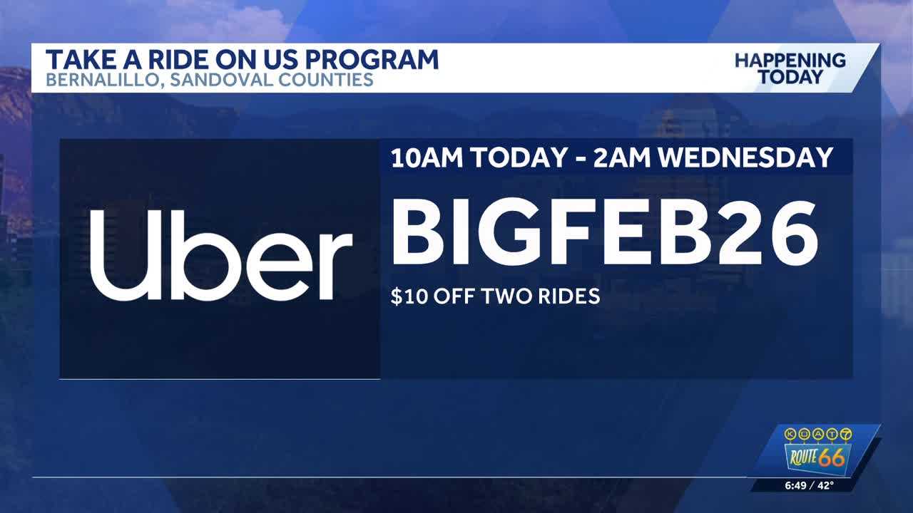 With Valentine’s Day and Mardi Gras celebrations approaching, residents of Bernalillo and Sandoval counties can make plans for a safe ride home through the Take a Ride on Us program.From 10 a.m. Friday, Feb. 13, through 2 a.m. Wednesday, Feb. 18, riders can use the code “BIGFEB26” in the Uber app under the “Vouchers” section to receive up to $10 off two rides. The offer is available on a first-come, first-served basis and is limited to the first 1,500 rides. The discount applies to Uber rides only and does not cover Uber Eats or driver tips.Since launching in 2017, Take a Ride on Us has provided more than 80,000 safe rides to residents across the Albuquerque metro area. This public-private partnership is committed to reducing impaired driving and keeping roads safer during holidays and special events when alcohol consumption tends to increase.Residents are encouraged to plan ahead, celebrate responsibly and take advantage of this limited-time offer while rides are available.For more information about Bernalillo County’s DWI prevention efforts, visit the county website.